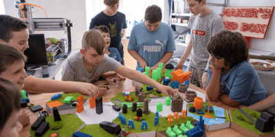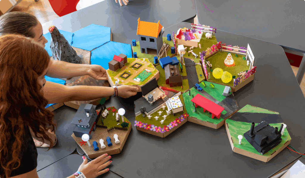 To make democratic decisions, they elect a mayor and resolve disputes through voting. At the end of the course, they present the completed model at a ceremonial city opening, where they explain how the buildings on their hexagons reflect their ideas.