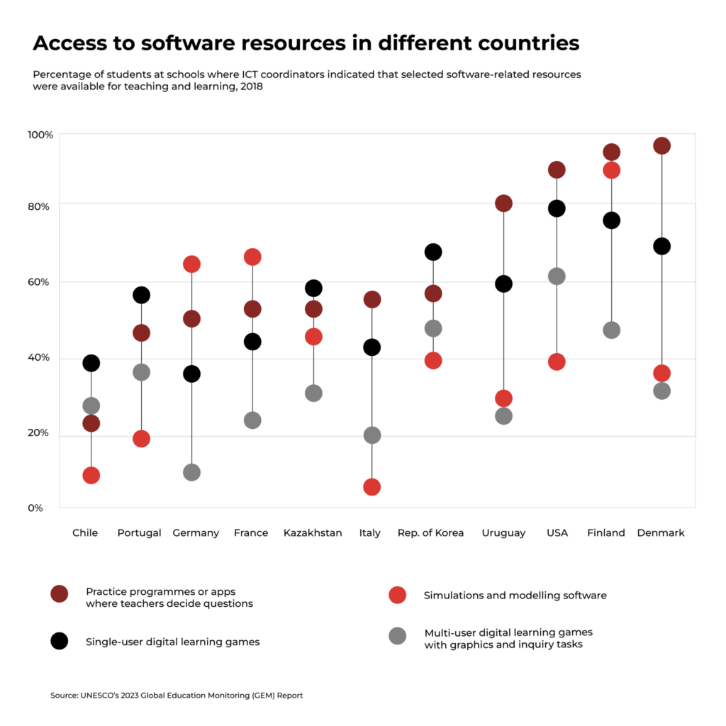 Significant national differences exist, however, as shown by the 2018 International Computer and Information Literacy Study (ICILS). In the 12 education systems examined, simulation and modelling software was accessible, on average, to one-third of students, with availability ranging from 8% in Italy to 91% in Finland.